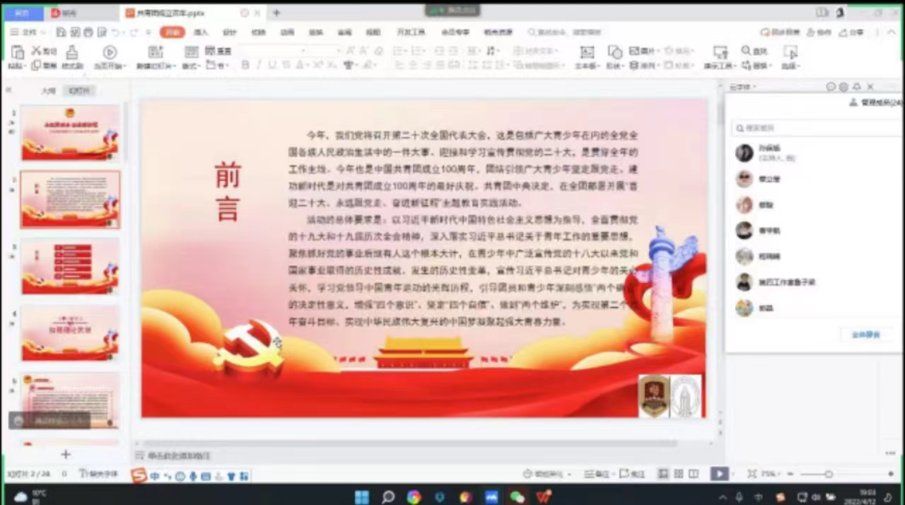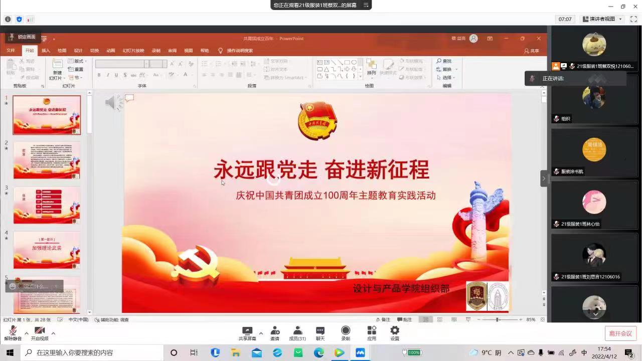 为庆祝建团100周年,教育引导广大团员学生学团史、强信念、践使命、跟党走,以昂扬姿态,践行社会主义核心价值观,传承红色基因,勇担青春使命。设计与产品学院于2022年4月12日在线上举办了中国共青团成立百周年主题教育实践活动。参与此次活动的有设计与产品学院学工办以及全体学生。