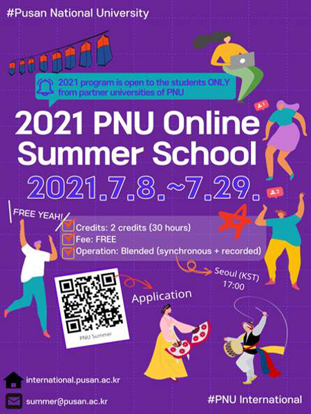 为了了解韩流基础的当代韩国电影、电视剧以及大众文化。我校合作院校韩国釜山大学计划于2021年7月8日-2021年7月29日为合作院校免费开设为期三周的在线课程,参与本次课程的同学以韩国釜山大学最终通知结果为准。