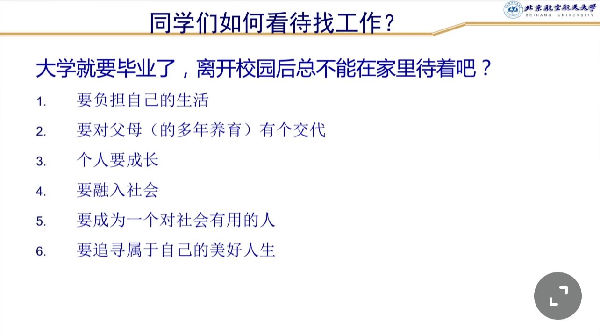 首先,作为当代大学生,我国毕业生有着优秀的专业素质以及专业知识性。但是在就业问题上,还是有很多的大学生面临着“大学就要毕业了,总不能在家呆着。”这种心理负担,同时同学们毕业之后,要负担起自己的生活,要对父母多年的养育之恩有一个交代,个人总归是要学会成长的,要融入社会,要成为一个对社会对国家有用的人。与此同时,同学们也要追寻着自己的美好人生,对自己的未来有一个具体的规划。此次直播,从有利因素和不利因素两方面加以分析,使学生对当前的就业形势有了一个清醒的认识。顺利就业需要四个方面的认知:1.个人的素质能力。2.目标的工作要求。3.工作匹配度。4.合理的应对工作方式。明白了这四项的意义,我们才能在职场中顺利的找到自己心仪的工作而且顺利就业。