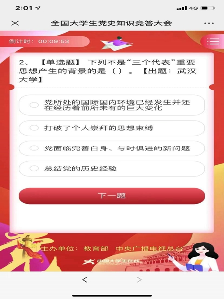 通过本次开展的“千校学生云答题”活动,使同学们对中国共产党更深层的认知,也为以后同学们对于入党奠定了基础和经验,指导了同学们在入党前做足准备,掌握技巧,了解了中国共产党的发展历史,获得深层次的理解。