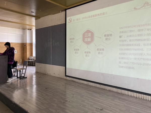 会议开始,学生党支部宣传委员尉焱对会议议程进行介绍,接着,以“星星之火 可以燎原”为题介绍了井冈山精神是中国共产党伟大精神的重要组成部。第一部分:井冈山革命根据地的建立,采用了三湾改编。第二部分:井冈山精神的科学内涵,与大家一起交流学习。我们要遵循三大纪律“一切行动听指挥、不拿群众一针一线、一切缴获要归公”。我们建设和发展中国特色社会主义,仍然必须保持这样一种理想信念,发扬这样一种优良传统和作风。
