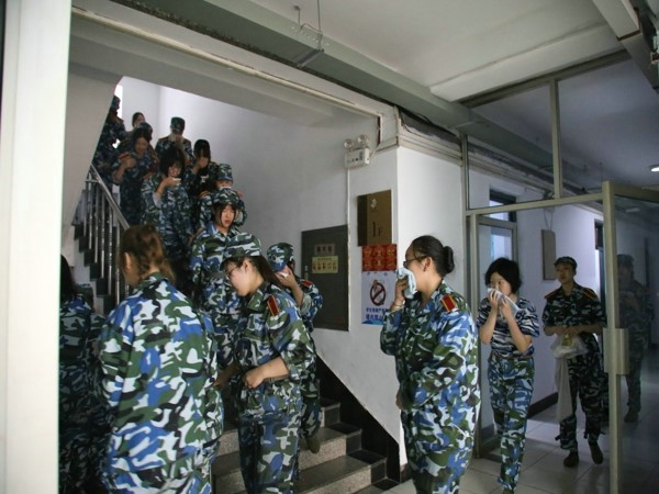设计学院学生在老师们的指挥下,按照指定路线,用手、袖口捂着嘴鼻迅速有序地进行紧急疏散