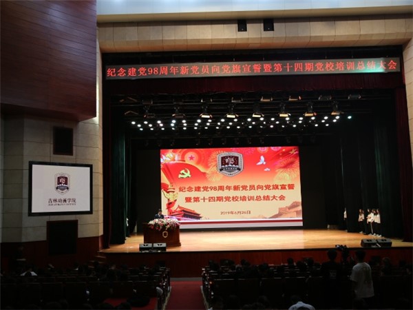 为积极推动党团思想政治建设,提高党校和保证后备党员的质量,为积极开展我院党政工作,落实党内政策。我校于2019年6月26日下午13:30在吉林动画学院文化艺术中心举行纪念建党98周年新党员向党旗宣誓暨第十四期党校培训总结大会,参加此次活动的有学校党委委员、各党总支书记、全校师生党员和第十四期入党重点积极分子。