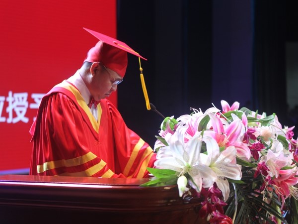 伴随着董事长、校长郑立国上台致辞,毕业典礼也进入了高潮阶段。董事长、校长郑立国回顾了四年间学校与学生们的共同成长,并叮嘱学生们要抓住机遇,紧跟时代步伐,迎接新的挑战。同时,希望大家心中有宇宙,脚下有乾坤,胸怀全世界,驰骋天地间。
