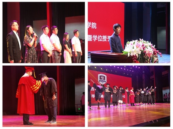 此次活动由副校长王晓岩主持,活动开始介绍了到场领导。活动首先由学校领导依次宣读2019届学生毕业决定、2019届学士学位授予决定 、2019届优秀毕业生决定、2019届毕业生平台力行奖学金决定、2019届17件优秀毕业生实物作品决定。接着,进行证书奖学金颁发环节,毕业生代表、优秀毕业生代表、奖学金获得者代表分别登台,双手接过光荣的证书,并与学校领导合影留念。接下来由吉林动画学院董事长、校长郑立国以及各分院院长一同为获得学士学位的毕业生授予学位并拨流苏。来自学校各学院的毕业生代表依次登台,他们一路小跑着来到校长的身边,一鞠躬胜过千言万语,一拥抱感谢师长教育之恩。董事长、校长郑立国为每一位登台的学子送上了祝福,他们郑重地倾听着校长的嘱托和叮咛,面容上都是感动和不舍。情之所至,有的毕业生将校长轻轻抱起,激动的心情随着双脚一起腾空,激动之时,更有毕业生单膝跪地,感恩之情凝在膝上。接下来由2019届毕业学生代表、在校学生代表、教师代表、辅导员代表、毕业生家长代表、工勤人员代表依次上台发言。
