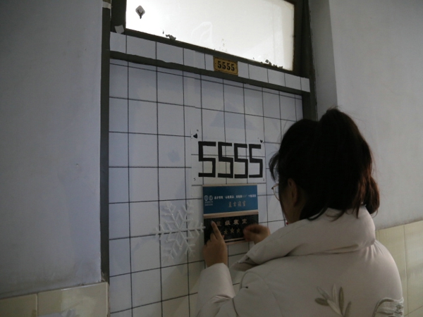 设计学院学生干部正在给我院同学优秀寝室粘贴寝室牌