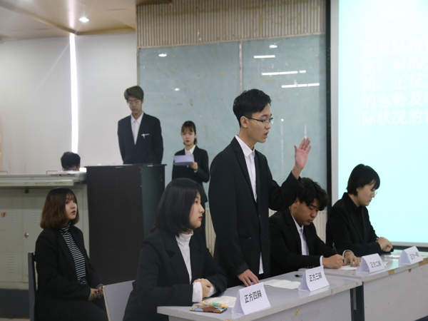 本次设计学院辩论赛决赛辩手正在进行激烈辩论