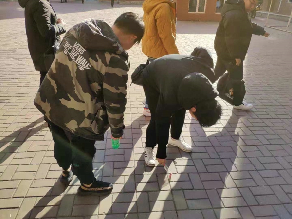 活动开始前,同学们有序的到达班级指定地点,有些同学在来的途中就已经投入到了捡拾白色垃圾活动中,沿路拾起地面上的垃圾。各班长给每三位同学分为一个小组,每组发一个塑料袋用来装垃圾。