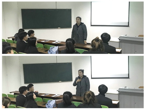 设计学院学工办主任李小为正在为换届选举大会讲话