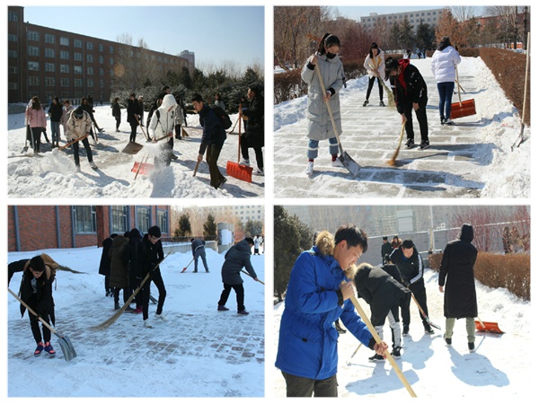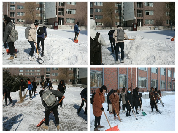最后,各班级依次将扫雪工具摆放整齐。经过一个小时的努力奋战,同学们团结协作,不惧严寒,将设计学院的积雪清理的干干净净,路面恢复了畅通。