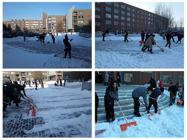 天冷、雪厚,清雪任务重,学生党员们全部武装,抢在先、干在前,大家有有说有笑,挥汗如雨,发扬了设计学院学生党支部团结协作、相互配合、齐心协力精神,学工办部分老师也加入扫雪行列。