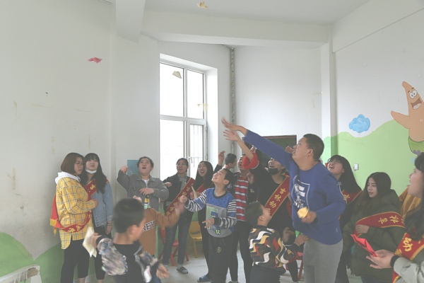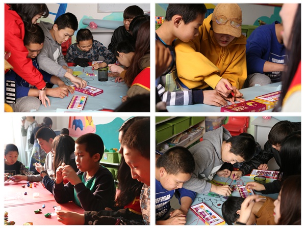 为了活动的顺利进行,设计学院团委学生会各部员为活动的展开提前做了充分的准备,给小朋友买了油画棒、粘土、折纸等等。抵达之后,院里老师热情地迎接,大家和孩子们在活动室一起唱歌,一起做游戏,刚开始有些孩子对这些“外人”有些抵触,带着好奇的眼光打量,但随着陪伴的时间愈久,对我们的目光越来越柔和,他们在活动中慢慢的融入,吱吱呀呀的叫着我们“姐姐”“哥哥”。老师拿来彩笔,卡纸和工具,大家和小朋友一起画画捏粘土叠纸飞机,部员们手把手地帮他们画、涂、折、粘。虽然他们不说话,但是他们的内心世界丰富多彩,活泼可爱。用心挑选颜色,认真折叠。大家一起俯首作画,笑声不断,他们的天真无邪感动了到场人员,大家的爱心温暖了他们。粘土制作完成,小孩子一脸自豪地拿给老师看,看着他们开心的样子,大家感到一丝欣慰。结束时,部员们帮忙收拾整理打扫卫生,和孩子们依依不舍地挥手道别。