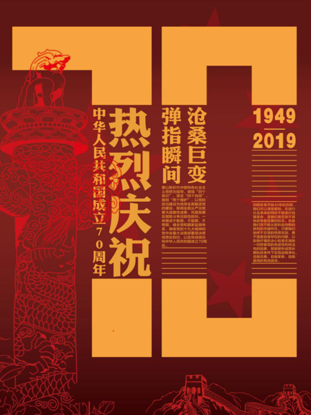 2019年10月1日是中华人民共和国成立70周年纪念日。为庆祝中华人民共和国成立70周年的光辉历程,设计学院师生用海报设计形式来传达对祖国的热爱和祝福。