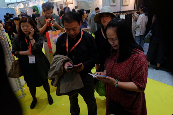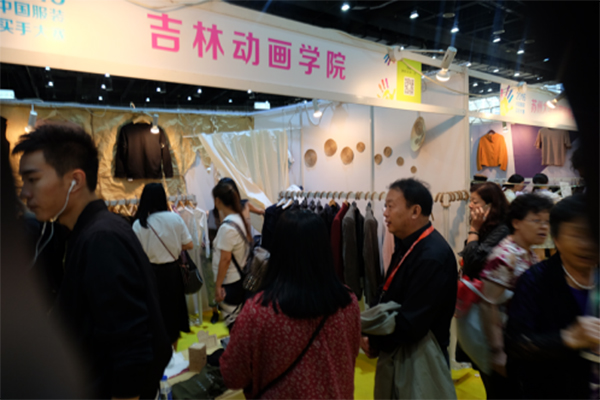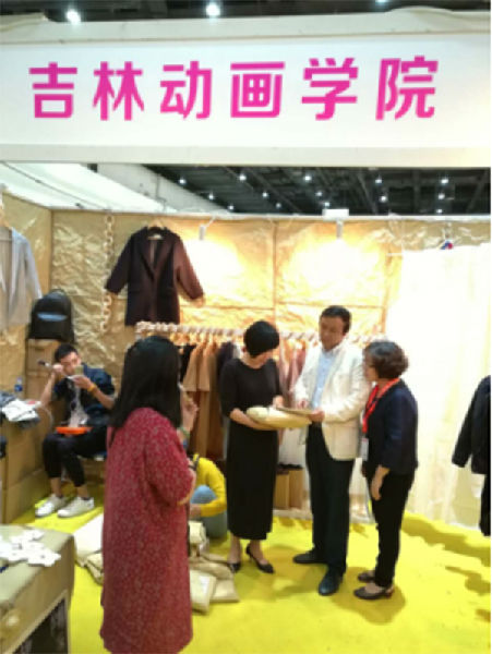 吉林省艺术设计协会执行会长兼秘书长、吉林省服装设计师协会常务副会长刘克力(右二)在我校展位查看销售情况并高度赞扬我校线上销售的成绩。