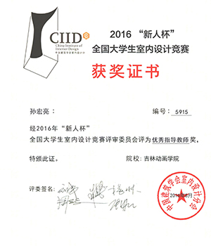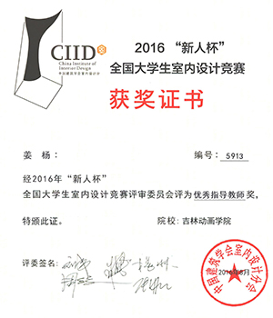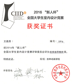 近日,从CIID2016“新人杯”全国大学生室内设计竞赛颁奖典礼上传来好消息,设计学院环境设计系13级室内设计第一工作室、第四工作室、第六工作室、建筑可视化设计第三工作室的8件作品入围,13名学生获奖,龚政等同学的4件作品分别获得优秀奖,李爽等同学的4件作品分别获得鼓励奖,姜杨等4名教师荣获最佳指导教师奖。这是设计学院学近几年来获得该项赛事优秀奖、鼓励奖最多的一次。