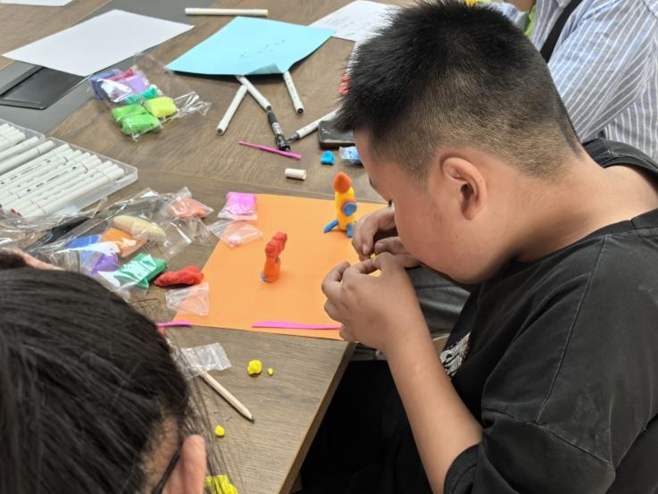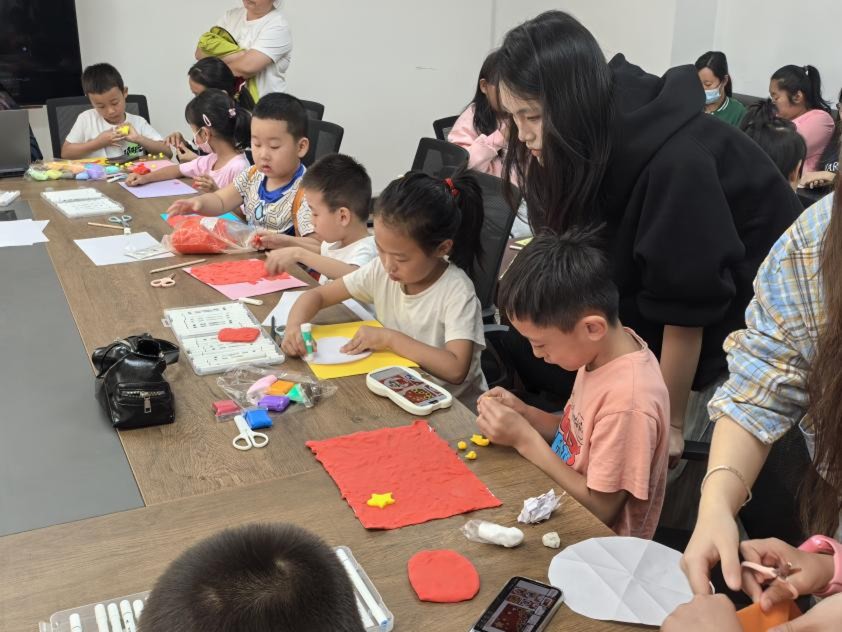 理论课程结束后,课堂进入手工、绘画实践环节。老师分发红色、黄色等超轻粘土和绘画工具,让同学们用双手传递爱国情。