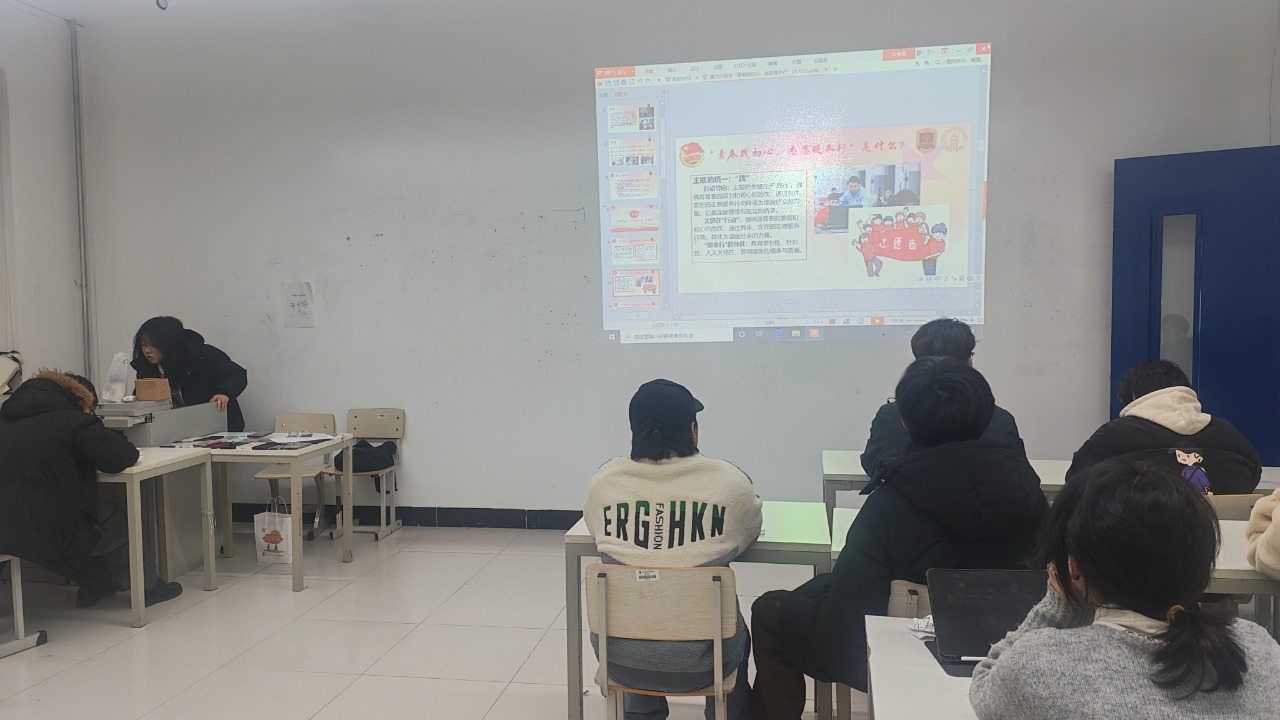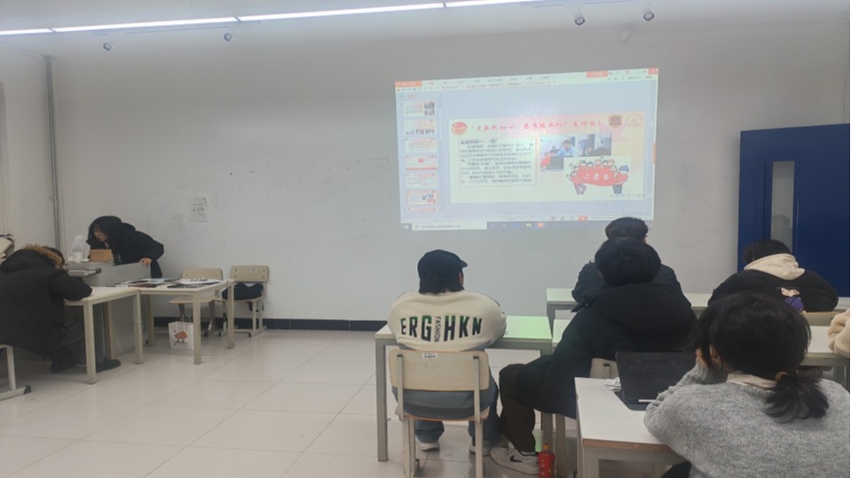 活动当天,专业教室内氛围温馨而热烈。墙面悬挂着团员们精心绘制的“暖冬志愿行动图谱”长卷,桌上陈列着前期准备的志愿服务方案与暖心文创作品,让团员们在沉浸式环境中感受志愿服务的意义与价值。